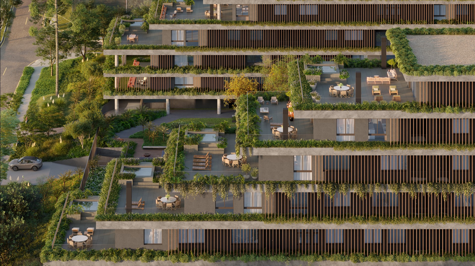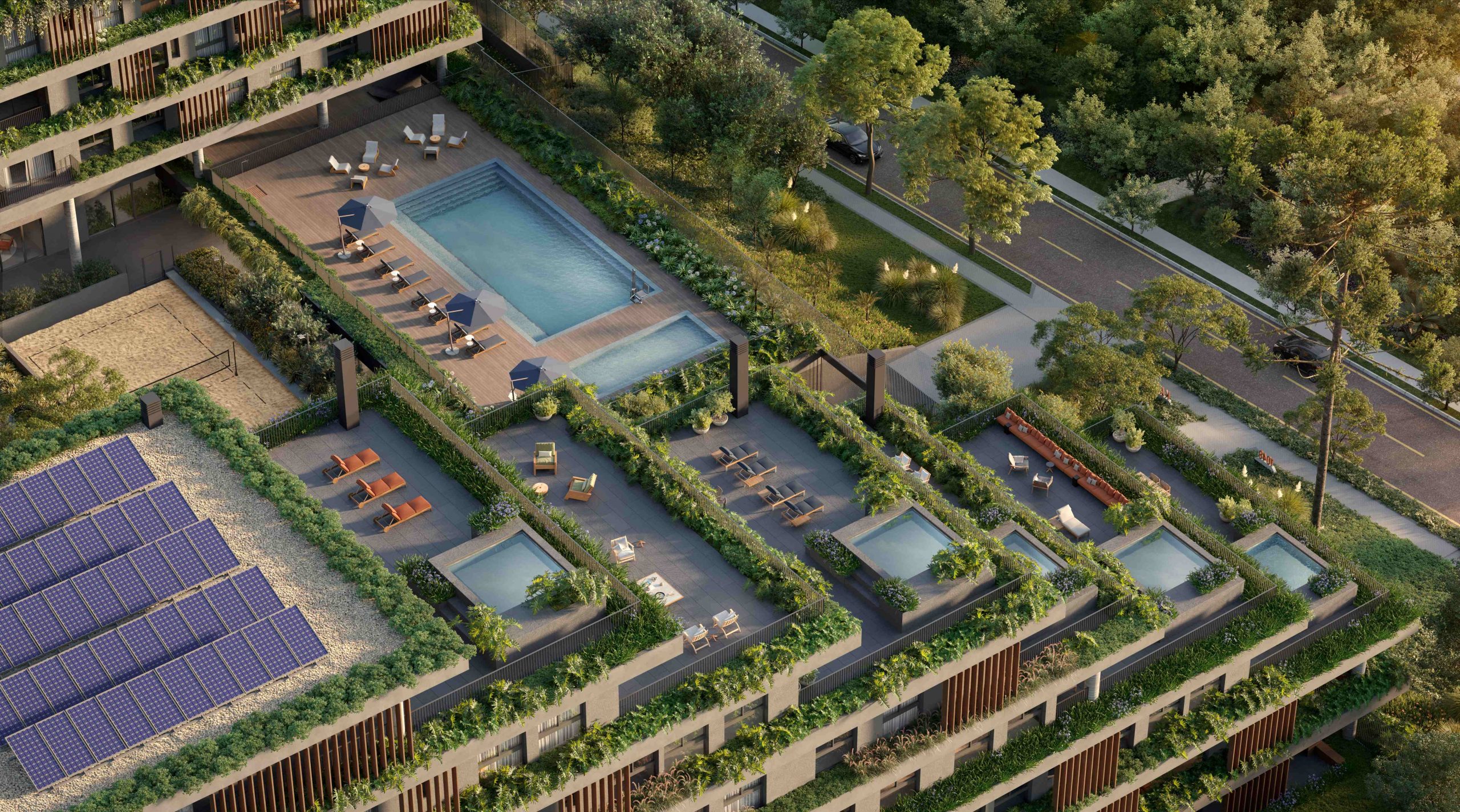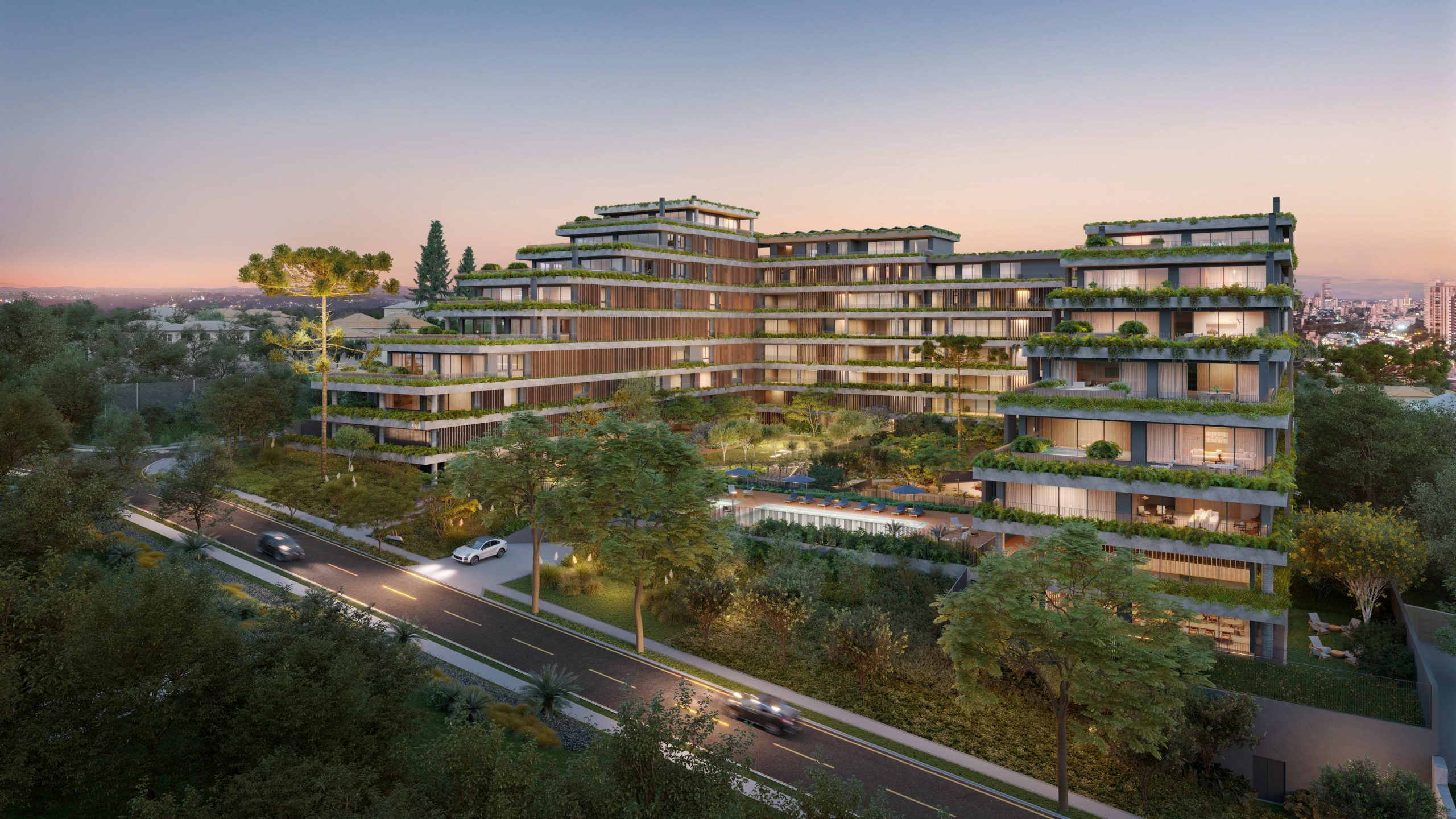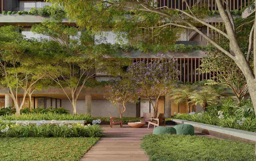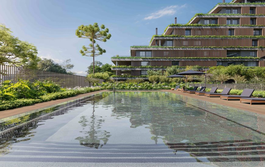 O projeto de arquitetura e a amplitude das áreas externas permitiram pensar a exuberância dos jardins, constituídos pela diversidade de espécies nativas e adaptadas à região de Curitiba, como uma característica inseparável dos ambientes construídos. Cada pavimento é abraçado pelo verde, emoldurando as vistas dos apartamentos para o entorno do bairro, e as áreas externas compõem com a natureza ambientes que promovem saúde e bem estar aos moradores.
