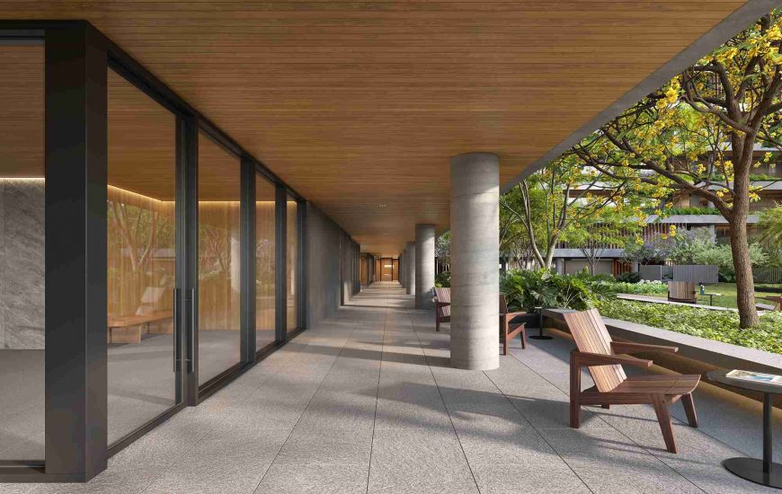 Ocupando toda uma quadra, o edifício se torna parte da paisagem em sua dimensão horizontal, de pavimentos únicos que acompanham a topografia do terreno. A praça interna do empreendimento e os percursos entre as áreas comuns trazem uma variedade de espaços abertos e outros mais reservados, com uma riqueza de perspectivas. Possibilitar essa capacidade de observar os arredores a partir de uma posição acolhedora, longe da agitação da cidade, garante boas condições para manter as pessoas mais tempo ao ar livre com conforto e segurança.